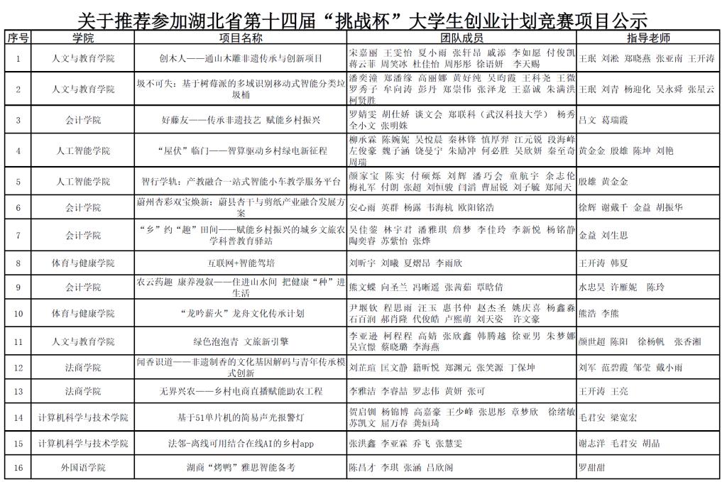 按照湖北省第十四届“挑战杯”大学生创业计划竞赛规则和评审要求,经过院系推荐、校级评审及线下答辩等环节,推荐我校16个项目参与省级评审,现将名单予以公示: